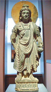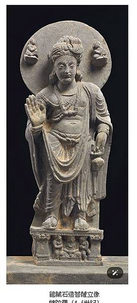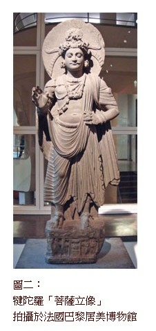 此菩薩立像帶有古希臘羅馬青年俊朗的輪廓神采,華貴酷似印歐混血的風度翩翩王子,與巴基斯坦犍陀羅地區夏巴茲加里(Shāhbāz-Garhī)寺院出土,一至三世紀片岩雕刻,現藏於法國巴黎居美亞洲藝術博物館的「菩薩立像」(圖二),有異曲同工之妙。嚴飾瓔珞的華彩流光,細膩華美的敷巾冠飾,巍巍威儀的俊雅姿態,高貴豪華的殊妙服飾,流露王侯貴族的王子氣派,無疑是悉達多太子成佛前菩薩裝扮的完美體現。