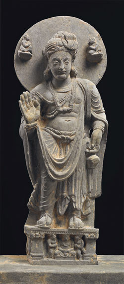 另一件館藏犍陀羅四至五世紀的「石造菩薩立像」,有圓形頭光,頭光兩側跪著二供養人。束髮型髮式,右手施無畏印,左手持水瓶,耳垂佩戴厚重耳環,胸前佩戴四重飾線,站在方形底座,足下亦著鞋履,正面底座方柱中間有一坐佛及左右二脇侍。四重胸飾,第一重是頸飾,是一寬帶首飾,代表古印度婆羅門貴族的身分;第二重是二股一束披掛於右肩上較簡單的飾線;第三重是斜至右脇,掛有數個小盒狀之「婆羅門飾線」;第四重是兩端飾有瑞獸頭,口啣寶珠狀聖物盒,由數股線狀組合而成之厚實U形「聖線」。菩薩上身袒露,肩披天衣,下著腰衣,裙裳繫帶紐結,刻劃寫實。此造像有彌勒菩薩的二大特徵,束髮型與持水瓶,束髮型是簡潔打一髮結自然下垂,是古代婆羅門的髮式。彌勒菩薩因其出身婆羅門,故其髮式為婆羅門之束髮型,並持婆羅門修行者的水瓶標誌。