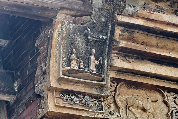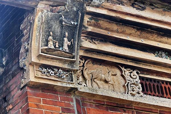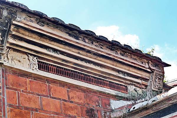 仔細看屋簷下方的裝飾,雖然磨損嚴重,但當年還是點綴上傳統故事,並有螭虎的圖騰等作為裝飾。