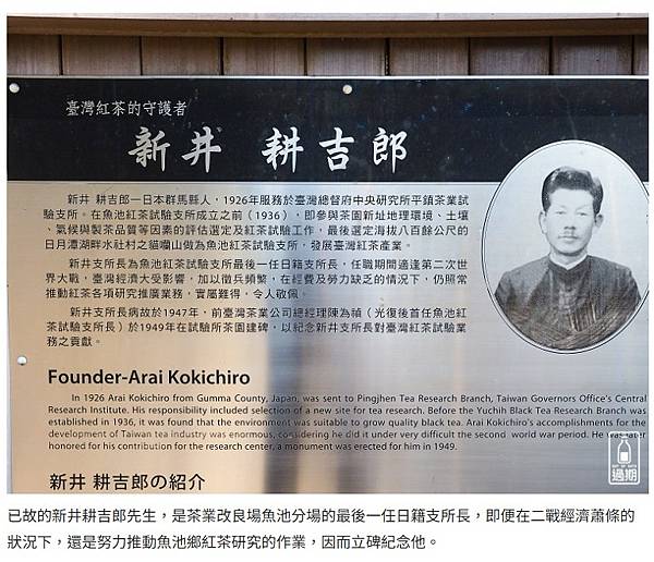 對了,在往茶改所路上的左邊會看到一座碑,是紀念日月潭紅茶之父「新井耕吉郎」,就是它開啟了日月潭紅茶的故事。新井先生於大正十五年(1926年)來到臺灣,原服務於平鎮茶葉試驗支所。昭和十三年(1936年)他帶著全家人到日月潭協助成立