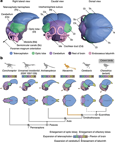 過去缺乏形狀保存良好的中生代(Mesozoic)鳥類化石,讓研究現代鳥類獨特頭骨與大腦的起源變得困難。近期,科學家在巴西發現了一種新鳥類化石「Navaornis hestiae」(尚無中文譯名),其頭骨保存完整且沒有牙齒、眼睛大、頭顱高聳,與現代鳥類非常相似。這組化石填補了從始祖鳥(Archaeopteryx)到接近現代鳥類之間長達6000萬年的空白期,有助於了解現代鳥類特徵形成的過程與時間點。