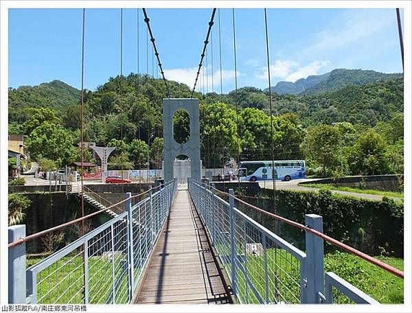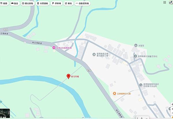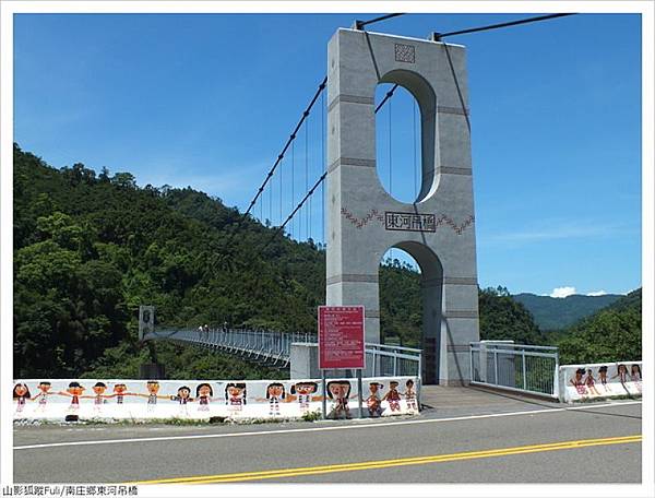 東河昔稱大東河,海拔350公尺,數百年前原為大河床,光復後改以東河村謂稱。民國59年(1970)9月6日,芙安颱風肆虐東河國小校舍沖毀,民國61年遷建現址,當時為便捷學童往返向天湖部落,民國63年於國小旁興建東河吊橋,橋長166公尺,寬1米,昔中港溪流域最長的一座吊橋,串接中加拉灣步道通行。民國91年南庄劃獅頭山風景區,交通部觀光局設處經管,民國102年改建跨越東河溪觀景吊橋,造型磅礡橋長185公尺,佇立橋上盡收溪谷蜿蜒美景,遠眺壯麗雄偉的石壁峽谷,令人心曠神怡煙塵盡滌。南庄鄉公所-東河吊橋 https://bit.ly/4hOmobH
