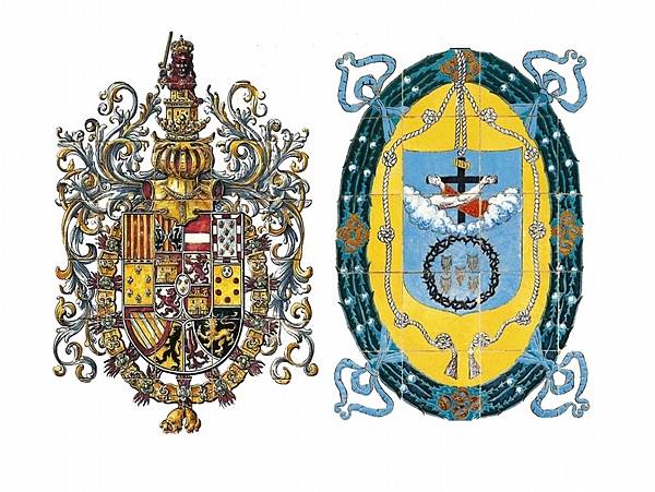 賽維亞皇家城堡檔案室中的《阿方索十三世徽章 》(左)及卡普切諾修道院的《方濟各會徽章 》。(王明彥提供)