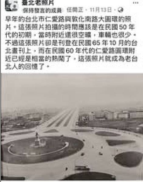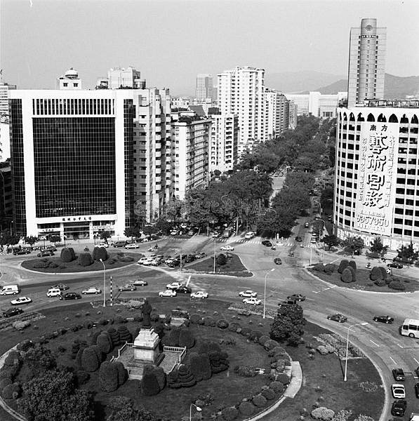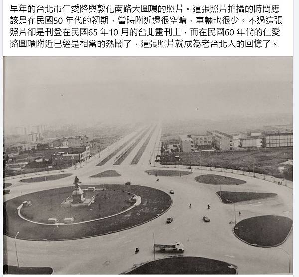 右上方是仁愛路往東,隱約可以見到仁愛路北側正在施工中的國父紀念館(1972年5月16日落成,好巧,正好是我的生日),而1984年營業至今的雙聖冰淇淋仁愛店就在圓環的左上角。圓環中心的銅像是我國第一任監察院長于右任先生(立於1966年),後來在陳水扁市長任內的元宵節燈會佈置時,銅像基座遭到破壞,於1997年遷移至國父紀念館的廣場放置。https://www.facebook.com/share/15LxAjef9g/