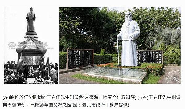 其實,圓環中心所紀念的就是中華民國第一任監察院長于右任先生。這座矗立於仁愛圓環30多年的銅像,臺北市政府在86年為了整頓周邊空間,而擬議遷往位在基隆巿中正公園旁,紀念以于院長為名的崇右企專。