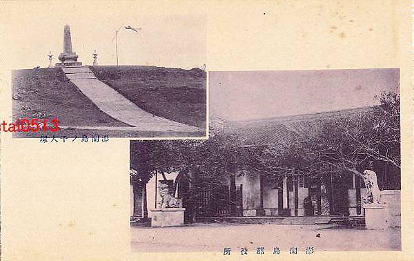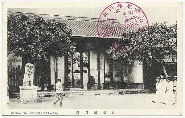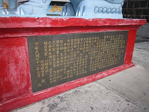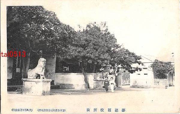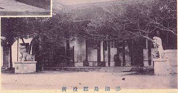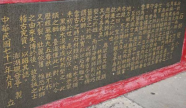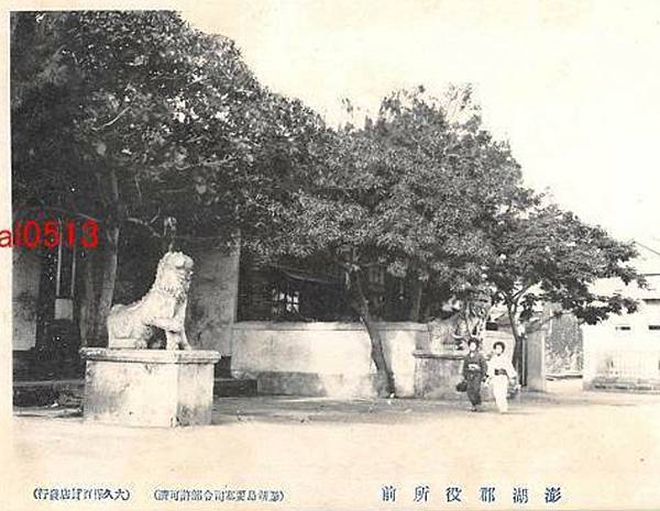 原舊日治時期澎湖廳舍(清末澎湖總鎮署衙門)前的灰泥雕塑獅像。根據獅像座下碑文記載,塑造施作者分別是林勇、彭海樂兩位師傅。