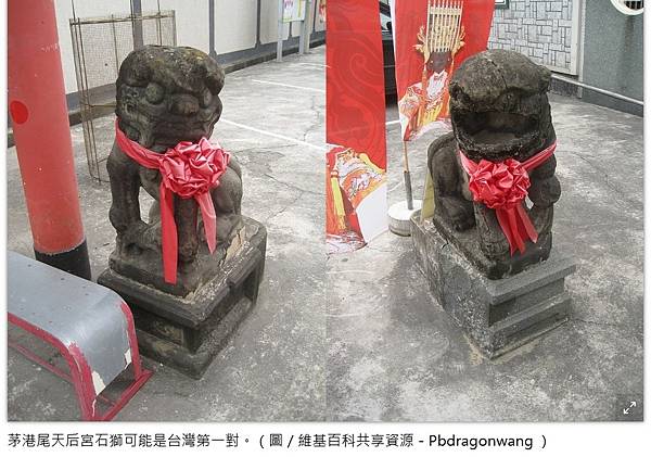 茅港尾天后宮草創於明永曆31年(西元1677年),天后宮總務組長高明正說,石獅從茅港尾天后宮建廟起就有,守護茅港媽和天后宮,因年代久遠,已是珍貴古物,但因風吹日曬雨淋,外貌受損嚴重,歷年來曾請示過茅港媽祖3次都不准。