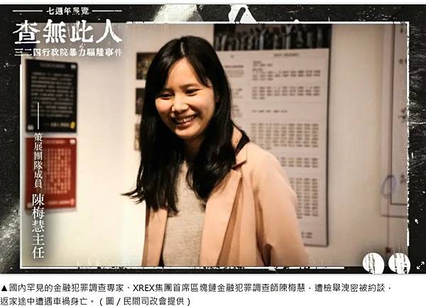 ▲國內罕見的金融犯罪調查專家、XREX集團首席區塊鏈金融犯罪調查師陳梅慧,遭檢舉洩密被約談,返家途中遭遇車禍身亡。(圖/民間司改會提供)