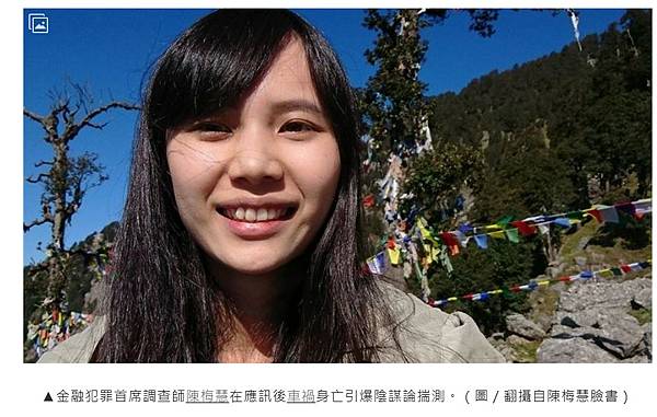 曾協助創意私房等矚目案件查金流的貨幣分析師的陳梅慧,前日因與男友謝姓刑事局偵查員,捲入洩密案到台中地檢署應訊後北返,乘坐uber在國道1號北上77.9公里發生車禍,陳梅慧座車遭後車追撞,再撞擊前方4輛車,等於被夾擊,她坐後座卡在變形車內傷重身亡,男友也重傷。