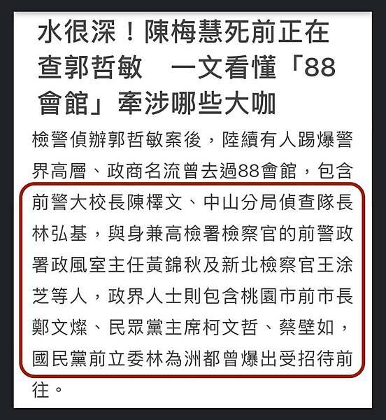 另外,許美華引述好友的兩點看法指出,陳梅慧目前在協助調查什麼案件?答案是八八會館,也就是柯文哲多次進出,建議可以去開會的那間會館。他認為,目前要優先處理的事情,一是保全追撞車輛的行車紀錄器,二是將追撞者的背景查出來,三是處理這件案件的檢警人員,手機通聯紀錄要全部拿出來分析。