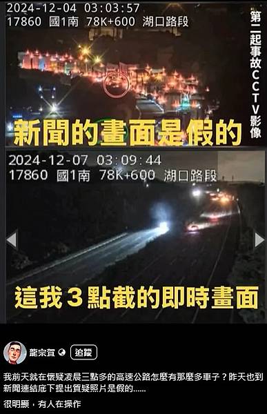 針對警方提供的國道擷取影像畫面,有網友不解事故明明發生在國道1號北向77.7公里處,為何影像是呈現「國1南」78.6K?對此,國道警方表示,國道架設的鏡頭都可南、北向拍攝,只是截取該事故影像的這支鏡頭是架設在南下車道,因為比較靠近車禍現場。
