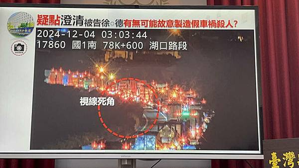 針對徐男是否可能製造假車禍殺人?檢方指出,案發當處是相當大的彎道,附近車輛都回堵,約有5、600台車塞車,若要刻意製造車禍的狀況,徐男根本不知陳女乘坐是哪台車,且若有其他車竄到內側車道,也有可能破壞犯罪計畫,因此從彎道視線死角的狀況下,研判應非製造假車禍。