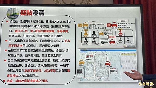 至於徐姓運將去年11月30日在Line群組接獲派車任務,預計12月4日凌晨從台中接了李姓夫妻北上,要前往桃園機場搭機飛至日本旅遊;車辨系統顯示徐男的車於4日0時12分50秒出現在台中市北屯區,李姓夫妻2時0分許上車,上台74線快速道路,2時11分許(ETC偵測時間)接國道一號高速公路北上大雅交流道前往桃園機場。
