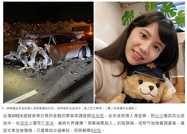 台灣XREX虛擬貨幣交易所金融犯罪首席調查師陳梅慧,去年底因捲入洩密案,到台中應訊完北返途中,在國道上遇死亡車禍,當時外界瘋傳「假車禍真殺人」的陰謀論,但新竹地檢署調查後,確認本案並無隱情,只是單純交通事故,同時解釋3疑點。