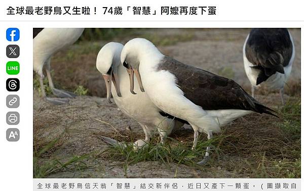 美國魚類及野生動物管理局透露,他們在上週發現「智慧」攜帶新伴侶,一起現身夏威夷群島最北端的「中途島國家野生動物保護區」(Midway Atoll National Wildlife Refuge),更還拍到這對夫妻一起照顧剛產下的蛋。畫面曝光後,令許多專家興奮地讚嘆,「牠(智慧)又做到了!」,同時祝福這位偉大的母親孵化過程順利。全球最老野鳥又生啦! 74歲「智慧」阿嬤再度下蛋 - 蒐奇 - 自由時報電子報 https://bit.ly/4gpQTU6