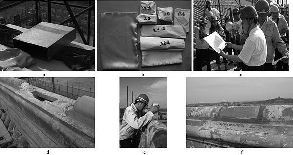 a—太和殿寶箱; b—部分放回太和殿寶箱的鎮物; c—鄭欣淼先生宣讀《太和殿修繕工程紀事》; d—龍口; e—寶箱入龍口; f—合龍口; f—合龍後屋頂。圖4 太和殿寶箱