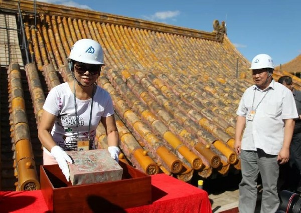 今年9月3日,故宮博物院院長單霽翔與前院長鄭欣淼相攜登上養心殿屋頂,在工作人員的協助下取出埋藏在屋頂正脊內的寶匣,標誌著養心殿修繕工程進入實施階段。
