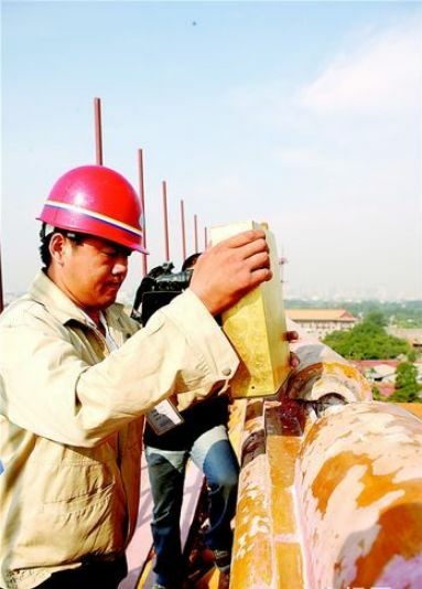 2007年9月5日9點,故宮博物院在太和殿大修結束前,舉行了隆重的寶箱「迎龍口」儀式。太和殿寶箱為銅抽屜式,表面鎏金,刻有龍紋,並帶有封裝鎮物用的銷子。在20世紀50年代的一次修繕中被取下,一直存放在庫房中。這次回放太和殿寶內的鎮物包括金錞和五經、五色緞、五色線、五香、五藥、五穀等物的殘存部分。儀式上,時任院長鄭欣淼先生宣讀了關於太和殿修繕經過的《太和殿修繕工程紀事》(簡稱「《記事》」)。隨後,該《紀事》與其他鎮物由工作人員分別裝入黃色錦囊袋中,並一同放入寶箱中。封裝好的寶箱,由太和殿施工負責人鄭重地交給預先選定的工人,再由工人沿著屋頂正中通向龍口的瓦壟登至龍口位置[9]。期間由多名人員陪同前後,稱之「護匣」。太和殿寶箱回放入龍口後,工人將預先準備好的扣脊瓦和泥砌好,即完成「合龍」儀式(圖4)。