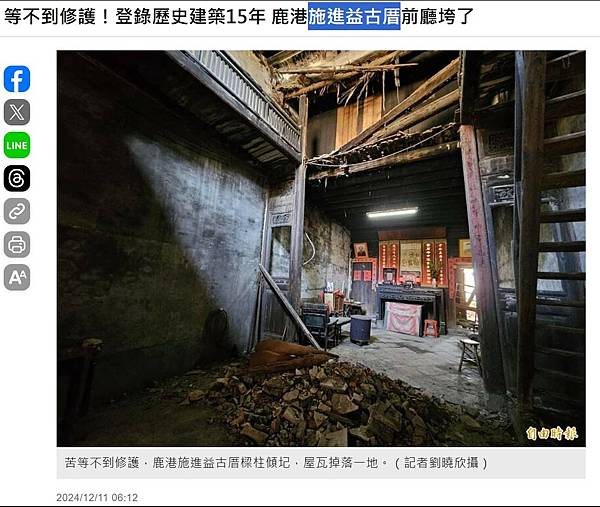 等不到修護!登錄歷史建築15年 鹿港施進益古厝前廳垮了 - 生活 - 自由時報電子報 https://bit.ly/4g4vUGo