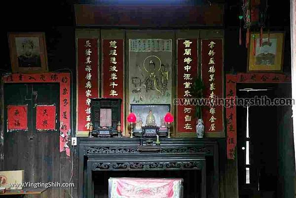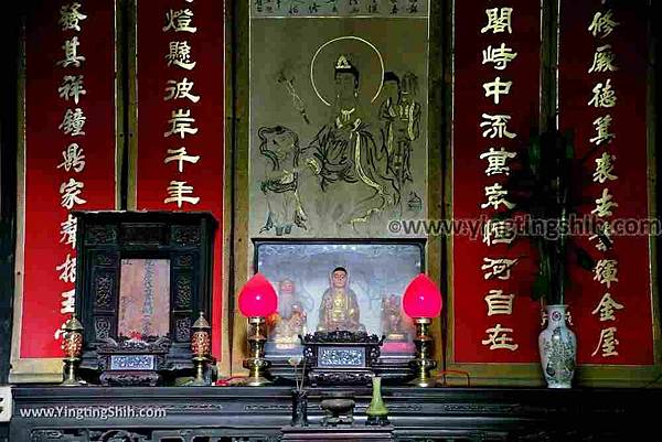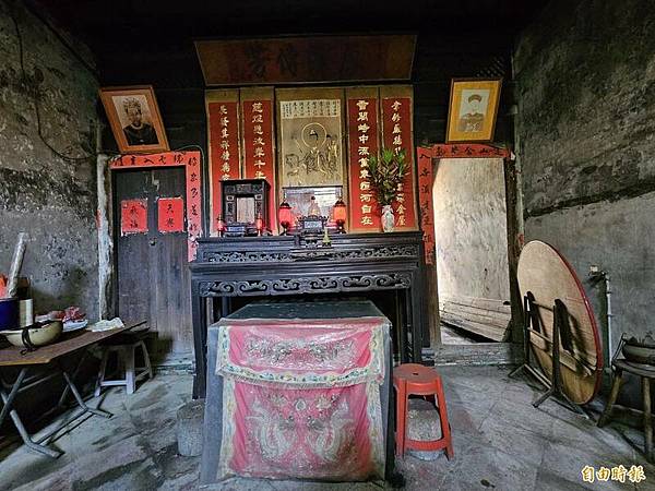 鹿港施進益古厝建於清嘉慶年間,目前施家古厝神明廳,供奉觀音菩薩與施家祖先牌位,廳堂也掛有施淵舉夫妻穿官服的畫像。(記者劉曉欣攝)