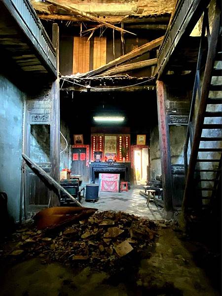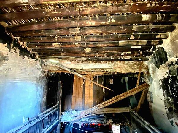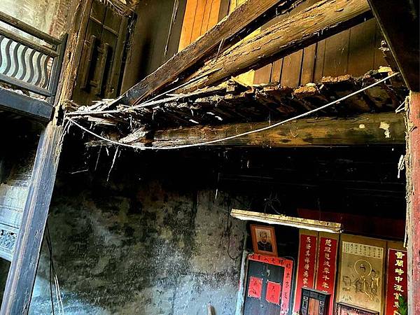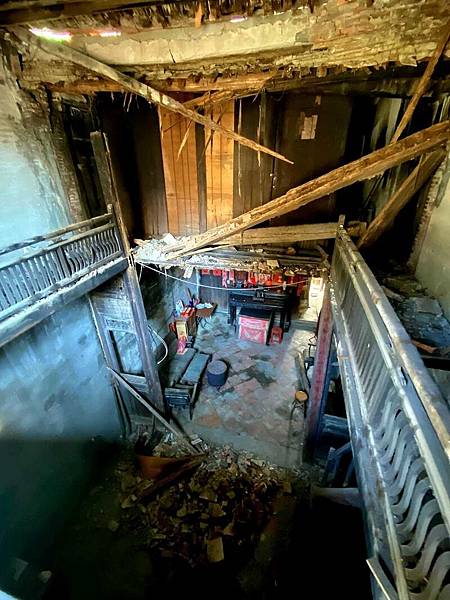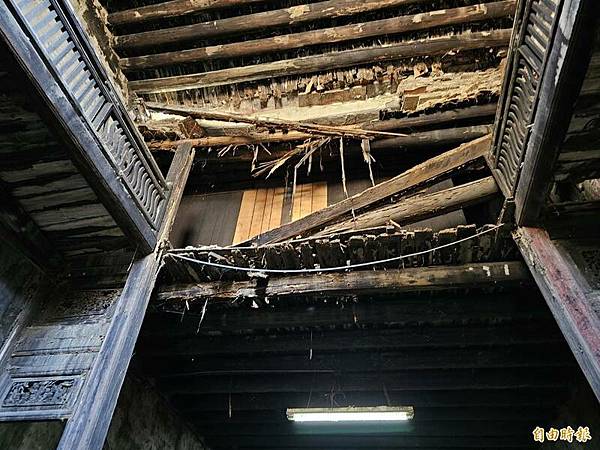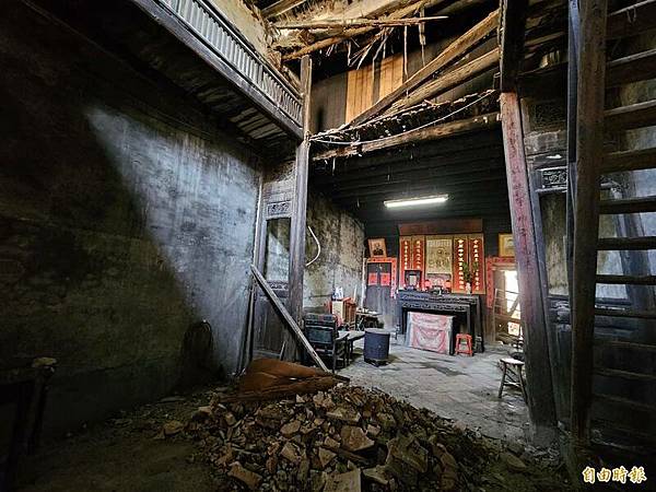〔記者劉曉欣/彰化報導〕彰化縣鹿港鎮大有街的施進益古厝2009年登錄歷史建築,至今已15年,苦等不到政府協助修護,也不見緊急加固,古厝飽受風吹日曬雨淋白蟻侵襲下,加上今年強震與颱風,前廳樑柱傾圮塌陷,原本挑高雄偉的樓井都毀了,連後代子孫都要戴上安全帽才敢為祖先與神明上香。