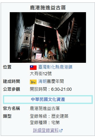 鹿港施進益古厝|文化資產複合查詢|文化部文化資產局--國家文化資產網 https://bit.ly/4gMspEL