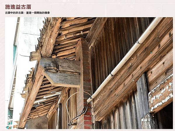 魏鍾生強調,施進益古厝因為後代子孫希望能夠保留傳統民居建築,所以是主動提報歷史建築的登錄,原本以為提報之後,縣府就會協助修護作業,但15年過去了,卻是進度聲聲慢,結果等到的只是古厝損害更加嚴重,尤其在山陀兒颱風過後,樑柱毀損傾圮,屋瓦掉落一地,古厝逐漸頹廢,為了安全起見,只好大門深鎖,連後代天天要上香拜祖先神明,都要戴安全帽。