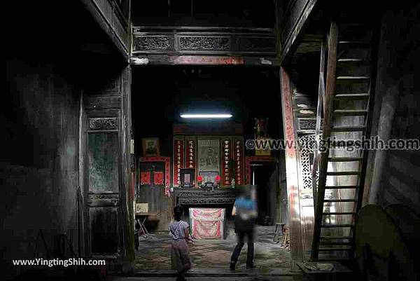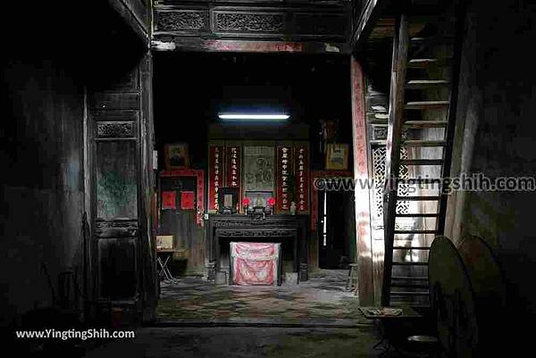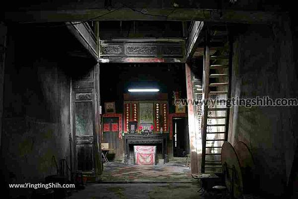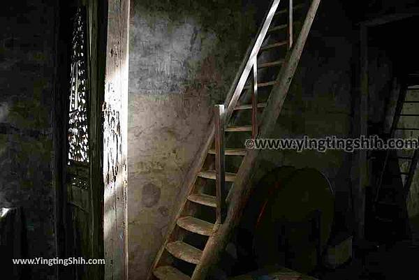 而本棟建築中唯⼀開設窗扇位置為⼀及二樓背牆位置,其餘皆為板門或固定門扇。位於⼀樓面門板屬於可拆卸式組合門板片,各門板片皆有作榫搭接⼀樓閣樓後方原應有兩扇通往左右棟鄰房門扇,但現況虎邊已被水泥封存,但左側門扇位置則以夾板封住。而整體建築中僅有公媽廳前方左右單扇為透雕固定門板,二樓主要為屋主活動空間,通行由天井龍邊樓梯可達二樓,不過與二樓樓板位置有⼀可由二樓上鎖板門,作為管制⼀樓人員通行動線。⼀樓樓井地坪現況鋪設水泥,公媽廳至後廂房廊道地坪則為尺二方形釉面板磚,二樓地坪則為木板面。