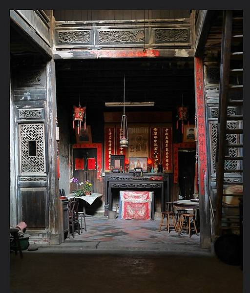 主屋形式為公壁相通天井相連,儒家講求兄友弟恭「家」的觀念依舊保留著。而公壁相通,使得分家的兄弟依舊保留有一個家的氛圍,如傳統住宅中的護龍,祖厝兩邊的街屋類似傳統住宅形式中的護龍,彼此相互照應,遵循著長幼有序的傳統倫理生活。後院形制格局為「四水歸堂」之二進天井配置,與中國徽州民宅相似;保有三棟連結形成的活動空間,落水管為陶製,將雨水導入陰溝;成為生活用水取水處。在風水上則有「水聚天心」招財聚氣、大利財祿的功用。