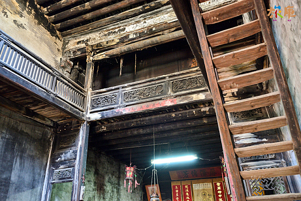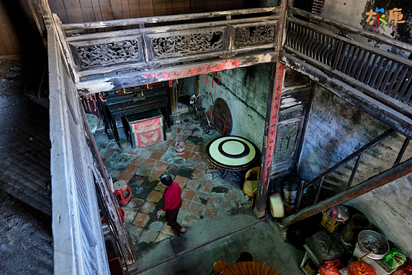 樓井位於入口儲物閣樓後方,為⼀方型挑空約8米二層樓空間,四周圍以欄杆,形如樓中之井,具有採光及通風功能。而樓井上多屬帳房空間,由二樓向下直視,可見⼀樓大⾨入口處,⼀樓往上直視只能望其屋桁,正面及兩側因雕刻飾品產生具有隱蔽視覺角度,故無法輕易看見二樓內部活動情。