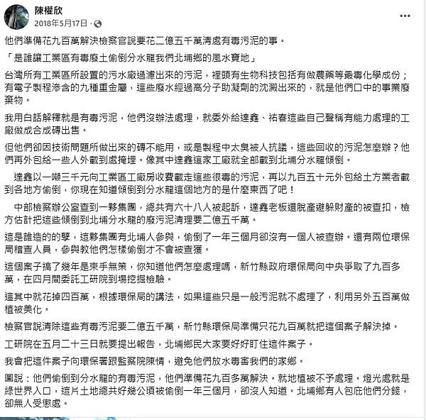 檢方起訴書中指出,達鑫公司在民國一百年取得新竹縣環保局核發乙級處理場的許可證,以合法掩護非法的方式,將來自竹科、龍潭工業區廠商產出的事業污泥,收回廠房未經適的處理就讓大貨車司機載出去任意棄置,藉此每月獲利高達七百萬元,分水龍的土尾場就是他們棄置這些夾雜事業廢棄物的地點之一。