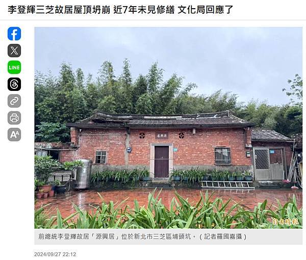 李登輝三芝故居屋頂坍崩 近7年未見修繕 文化局回應了 - 生活 - 自由時報電子報 https://bit.ly/4izRt3a
