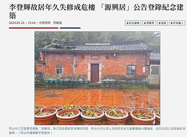 新北三芝源興居是已故前總統李登輝故居,百年歷史閩式古厝,因產權複雜,難登錄歷史建築。文化局透過李登輝基金會介入協助整合,終於4月29日文資審議會決議通過,5月22日公告登錄紀念建築。李登輝基金會執行長鄭睦群說,依法修復經費5%由所有權人支應,雖然董事長李安妮沒有產權,但承諾會協助後續延伸經費。