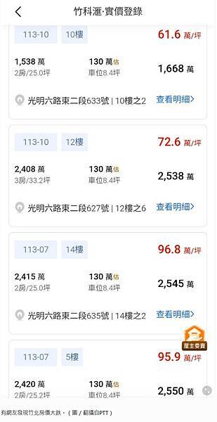 民眾在PTT分享賣房平台的實價登錄,顯示位於新竹縣竹北市光明六路的某15層樓社區,其面積33.4坪的10樓某戶於今年10月出售,成交總價1668萬元、換算單價大約61.6萬元,對比同社區面積24.95坪的14樓某戶,後者於今年7月以總價2545萬元成交、換算單價高達96.8萬元,令他直呼「這波金龍海嘯竹北也掃到了嗎?」