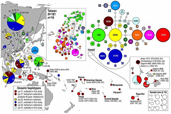 鍾國芳團隊搜集東亞與南太平洋各島嶼的構樹樣本,根據特定葉綠體基因序列分析顯示,這些構樹樣本帶有 48 種不同的單倍型。其中 CP-17 單倍型(紅色圓圈)在大洋洲佔大多數,也出現在臺灣南部。圖中右上方可看到,CP-17 由臺灣南部特有的 CP-16 (粉紅色圓圈)、CP-9 (橘色圓圈)演化而來,與臺灣北部、亞洲大陸常見的 CP-1 (綠色圓圈), CP-20 (黃色圓圈)關係較遠。圖│A holistic picture of Austronesian migrations revealed by phylogeography of Pacific paper mulberry