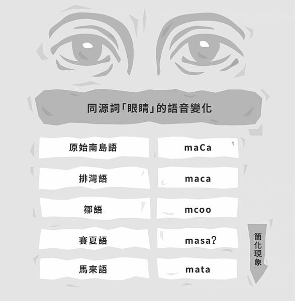 從同源詞「眼睛」的語音變化可發現,排灣語、鄒語較接近原始南島語,而賽夏語、馬來語的發音出現簡化現象,從中可看出族群發展的先後順序。 圖|研之有物