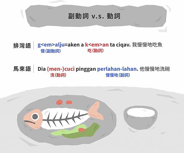 排灣語的「g<em>alju」就是一個副動詞,意思是「慢」,之所以看出它是一種動詞,關鍵在於它跟後頭表示「吃」的動詞「k<em>an」有一樣的詞綴變化「em」。而中間的連繫詞 a 亦可應證「g<em>alju」與「k<em>an」應同屬於動詞。此外,「g<em>alju」的後面連接附著代詞「aken」表示「我」的意思,附著代詞一般會貼在動詞上。