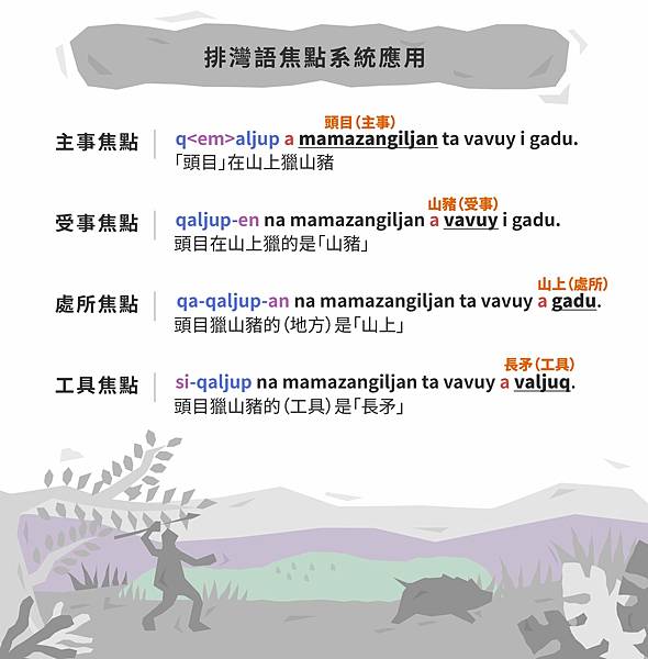 排灣語焦點系統應用,句首動詞 qaljup(打獵)會因應不同焦點而加上不同詞綴,焦點前方也會加上格位標記 a 來指稱重點。