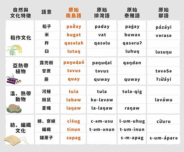 語言學家從原始南島語、原始排灣語、原始泰雅語、原始鄒語彙整出 100 個基本同源詞,當中包含許多指稱農作物、野生動植物、生活日用品的字詞: