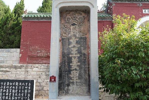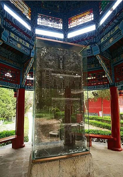 東側石碑是著名的“禹碑”,相傳是紀念大禹治水的功德碑。該碑高181厘米,寬132厘米,厚29.5厘米,碑陽上刻有77字,字形如蝌蚪,既不同於甲骨鐘鼎,也不同於籀文蝌蚪,蒼古難辨。該碑原刻於衡山嶁峰,故又稱岣嶁碑。明嘉靖二十年(西元1543年),湯陰知縣張應吉偶得此碑拓片,故翻刻於此。碑陰文為湯陰知縣楊慎寫的《禹碑歌》。禹碑雖然與文王無關,但是作為文王廟裡的歷史文物,為遊客增添了不少情趣。