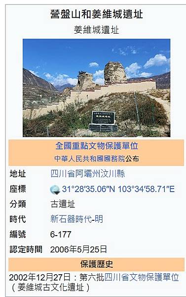 「姜維城」傳為三國時期姜維所築之城。但後經考證並未姜維所築。 現存姜維城是在明孝宗弘治年間(1488-1508年)將過去朝代所建的作戰城堡連接起來,重新構築的。城牆將玉壘山包裹在內。但目前殘存城垣百餘米。城外高7米。寬4米的黃土墩是當年的點將台。 石城周142丈,高160尺,有兩道門,上建城樓。1921年7月,法國地質學家葉長青牧師在川邊康藏考察發現彩陶陶片,被證實為屬於甘肅「馬家窯」文化範疇。距今5000~7000年。《元和志》記載:蜀將姜維,馬忠等徵發汶山羌夷,此其地也。今姜維城。及維所築。《舊唐書》記載,蜀到禪時,蜀將姜維、馬忠徵發汶川羌夷,即此也。今州城即姜維故壘也。《汶川縣誌》:明弘治中,擬遷威州於汶川,知州趙符節、千戶趙方築威城包玉壘其內,石壁刻玉壘山三大字,明正德七年,知縣李明築石城周一百四十二丈,高一丈六尺,二門,門各有樓。東山腰平坦處,即清古城坪,今俗稱姜維城是。