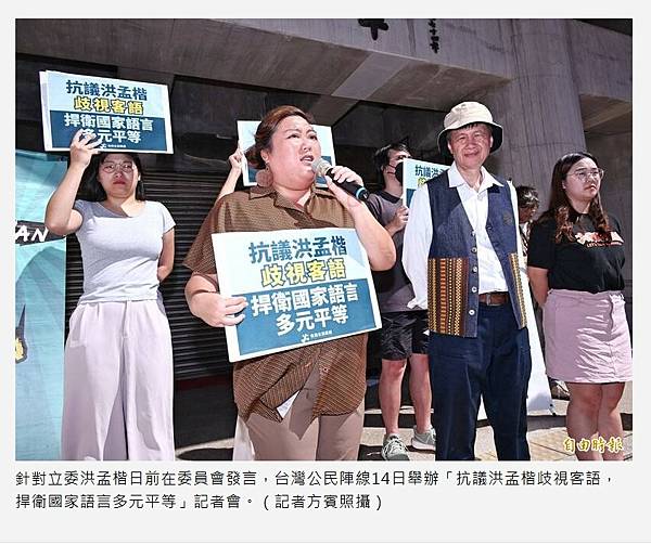 〔記者林哲遠/台北報導〕國民黨立委洪孟楷9日在立法院內政委員會質詢時,因聽不懂客語、不想帶翻譯機,向國⺠黨內政委員會召委徐欣瑩反映,徐隨即要求客委會主委古秀妃必須用「國語」發言,此舉引發客語人士不滿,也違反「國家語言發展法」。對此,台灣公⺠陣線今日邀請多個推廣語言民團召開記者會抗議,洪孟楷與徐欣瑩委員在立法院歧視客語,要求兩人正視歷史為打壓客語道歉。