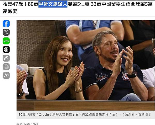 〔即時新聞/綜合報導〕2024《富比世》全球榜第五富豪、現年80歲的甲骨文(Oracle)創辦人艾利森(Larry Ellison)被稱為「矽谷的花花公子」,曾有過4段婚姻。近日英國媒體爆料指出,其33歲的第五任妻子朱喬琳(Jolin Zhu)來自中國瀋陽,曾是赴美留學生,現與年齡相差47歲的丈夫住在價值1.1億美元(約新台幣35.9億)的頂級莊園裡。