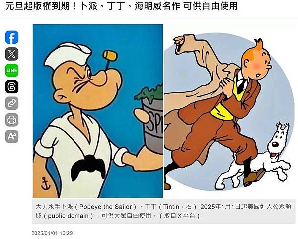 大力水手卜派(Popeye the Sailor)、丁丁(Tintin,右) 2025年1月1日起美國進入公眾領域(public domain),可供大眾自由使用。(取自X平台)