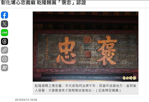 彰化埔心忠義廟 乾隆賜匾「褒忠」認證 - 生活 - 自由時報電子報 https://bit.ly/4047tSV