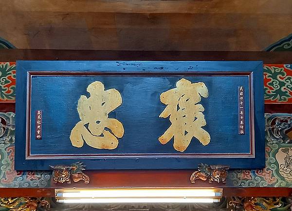 乾隆御賜之褒忠匾,年代卻為同治庚午年,因當年送錯地方,直到後人發覺,才請鹿港秀才施梅樵依樣做出。(記者陳冠備攝)