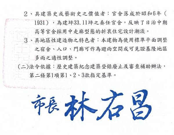 2.具建築史或藝術史之價值者:官舍落成於昭和6年(1931),為建坪33.11坪之奏任官舍,反映了日治中期高等官舍採用中走廊型態的折衷住宅設計潮流。
