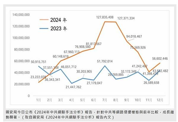 國安局表示,就趨勢發展部分,國安局依據政府網際服務網「入侵偵測指標」統計,我國政府網際服務網去(2024)年每日平均侵擾數為240萬次,較前(2023)年日平均侵擾數120萬次翻倍,其中多數為中共網軍所為。雖我方多已有效偵阻,惟仍凸顯整體網駭侵擾態勢愈趨嚴峻。