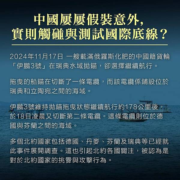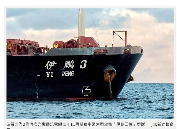 去年12月,歐洲波羅的海也發生中國散裝貨船「伊鵬3號」故意拖斷2條分別連接芬蘭和德國、瑞典與立陶宛的國際海底電纜,被多國執法單位擋下調查,「沒有人相信這些電纜是偶然被拖斷」。