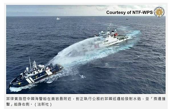 菲律賓指控中國海警船在黃岩島附近,對正執行公務的菲國巡邏船發射水砲,並「擦邊撞擊」船身右側。(法新社)